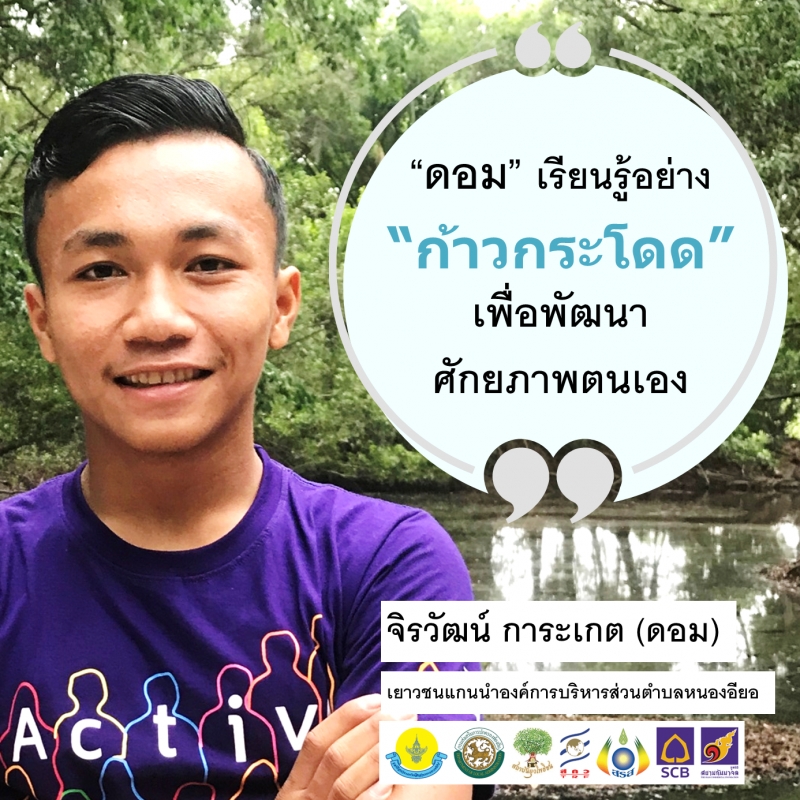 นายจิรวัฒน์ การะเกต หรือ ดอม หนึ่งในเยาวชนแกนนำ องค์การบริหารส่วนตำบลหนองอียอ อำเภอสนม จังหวัดสุรินทร์ ที่มีความมุ่งมั่นในการพัฒนาศักยภาพของตนเองเข้ามาร่วมเรียนรู้กับเพื่อนๆ คนอื่นในพื้นที่มานานว่า 4 ปี ล่าสุดมาเข้าร่วมเรียนรู้ผ่านค่าย 10 วัน (ค่ายพัฒนาศักยภาพแกนนำเยาวชนสู่การเป็นคนรุ่นใหม่ที่สามารถดึงศักยภาพของตนเองออกมารับใช้ชุมชนสังคมอย่างสร้างสรรค์) เพราะคาดหวังจะให้ตนเองเปลี่ยนแปลงอย่างก้าวกระโดดในการพัฒนาศักยภาพตนเอง “ดอม” ได้มาแชร์ให้เพื่อนๆ ได้ฟังกันถึงการเปลี่ยนแปลงที่เกิดขึ้นเพื่อเป็นประโยชน์แก่เพื่อนเยาวชนคนอื่นๆ ที่ต้องการเปลี่ยนแปลงตนเอง