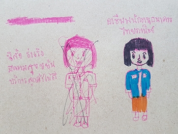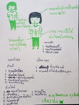 "สำรวจรูปร่าง-หน้าตา :- ชอบผมหน้าม้าเพราะน่ารัก ชอบแขนเพราะไว้ใช้ประโยชน์มากมาย, ไม่ชอบเหนียงเพราะไม่สวย ไม่ชอบสะโพกเพราะมันใหญ่กว่าตัว / นิสัยด้านบวก :- ช่วยเหลือเพื่อน เชื่อฟังครูและพ่อ-แม่ ทำการบ้านส่งทุกครั้ง ช่วยพ่อ-แม่ทำงานบ้าน ช่วยเหลือรุ่นน้อง อารมณ์ดีทำให้เพื่อนมีความสุข / นิสัยด้านลบ :- เอาแต่ใจบางเวลา เถียงเพื่อน นินทาเพื่อนในทางไม่ดีบ้าง ไม่ชอบคนจู้จี้ ตีเพื่อน อารมณ์ร้อน เถียงครู / ความถนัด-ความชอบ :- ชอบวิชาดนตรี วิทยาศาสตร์และชอบเตะบอล"