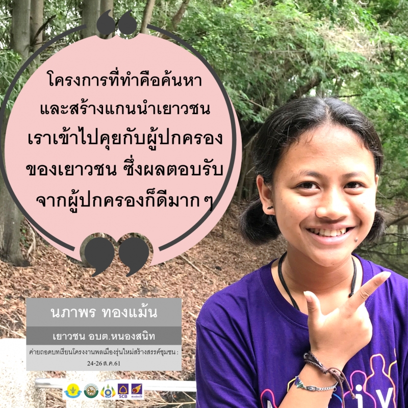 สำหรับโครงการที่ทำคือค้นหาและสร้างแกนนำเยาวชน โดยเริ่มจากการประชุมกันกับคนในทีมและสิ่งที่เราทำสิ่งใด คือเข้าไปคุยกับผู้ปกครองของเยาวชน ซึ่งผลตอบรับจากผู้ปกครองก็ดีมากๆ เป้าหมายเราอยากให้เยาวชนมีส่วนร่วมในการพัฒนาหมู่บ้านและชุมชน ทำสิ่งที่ดีที่สร้างสรรค์เพื่อชุมชนและตัวเรา หลังจากนั้นเราก็เริ่มลุยต่อ เรามีการแจ้งหนังสือประชาสัมพันธ์ให้เยาวชนรับทราบว่า พวกเราจะมีการจัดกิจกรรมเกี่ยวกับเยาวชน ซึ่งเราจะมีเกมให้เล่นมีการพูดคุยกับเพื่อน ซึ่งประชาสัมพันธ์ในหลายๆ ที่วันงานก็มีน้องมาร่วมกิจกรรมเยอะมาก เกินเป้าที่เราตั้งไว้ เพราะเราทำกิจกรรมเล่นเกมส์ เราได้กลุ่มเยาวชนที่เป็นเป้าหมายของเราที่จะตั้งกลุ่มได้มาสมทบทีมของเรา มีการตั้งกลุ่ม LINE ไว้พูดคุยหรือนัดประชุมกันหลังจากนั้นก็ลุยงานกัน งานในหมู่บ้านของเราก็มีเยาวชนมาร่วมช่วยกัน ไม่ว่าจะเป็นงานเทศกาลร่วมประชุมพัฒนาหมู่บ้าน ทุกคนร่วมมือร่วมใจกันไปทุกคนขอบคุณค่ะ