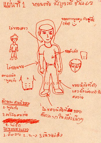 "สิ่งที่ชอบบนใบหน้าและบนร่างกาย :- ชอบปาก เพราะชอบการพูดคุยกับผู้อื่น ชอบลำตัว / สิ่งที่ไม่ชอบบนใบหน้าและร่างกาย :- ไม่ชอบเคราและแขน / นิสัยด้านบวก :-ยิ้มบ่อย เข้าสังคมง่าย / นิสัยด้านลบ :- ชอบคิดมากในเรื่องเล็กๆ / ลักษณะของบุคคลที่ชอบ :- พูดเก่ง เข้ากับคนง่าย น่ารัก / ลักษณะของบุคคลที่ไม่ชอบ :- คิดลบ พาล เห็นแก่ตัว"