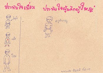 “เพื่อน :- อุ้ย แอ๋ม โอม / ผู้หลักผู้ใหญ่ :- ครูสำราญ"