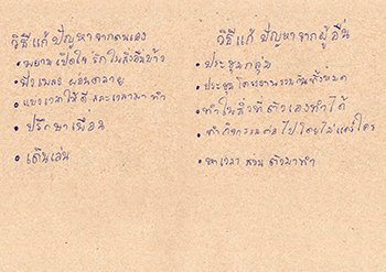 “วิธีแก้ปัญหาจากตนเอง :- พยายามเปิดใจรักในสิ่งอื่นบ้าง ฟังเพลงผ่อนคลาย แบ่งเวลาให้ดีสละเวลามาทำ ปรึกษาเพื่อน เดินเล่น / วิธีแก้ปัญหาจากผู้อื่น :- ประชุมกลุ่ม ประชุมโครงงานรวมกันทั้งหมด ทำในสิ่งที่ตัวเองทำได้ ทำกิจกรรมต่อไปโดยไม่แคร์ใคร หาเวลาส่วนตัวมาทำ"