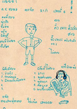 "สิ่งที่ชอบบนใบหน้าและบนร่างกาย :- ชอบคิ้วเพราะคิ้วเข้ม ชอบนิ้วเพราะหยิบจับสิ่งของ / นิสัยด้านบวก :- ร่าเริง ช่วยพ่อแม่ มีความรับผิดชอบ / นิสัยด้านลบ :- เกเร พูดคำหยาบ พูดมาก ติดเกม หาเรื่องเพื่อน / ลักษณะของบุคคลที่ชอบ :- น่ารัก ขี้เล่น ขยัน นิสัยดี / ลักษณะของบุคคลที่ไม่ชอบ :- ขี้เกียจ / ความถนัด-ความเชี่ยวชาญ :- เล่นฟุตบอล เล่นเกม"