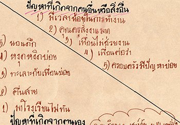 “ปัญหาจากตนเอง :- มาโรงเรียนไม่ทัน ตื่นสาย ทะเลาะกับเพื่อนบ่อย หงุดหงิดบ่อย นอนดึก / ปัญหาจากผู้อื่น :- มีเวลาน้อยในการทำงาน คุณครูสั่งงานมาก เพื่อนไม่ช่วยงาน เพื่อนต่อว่า ครอบครัวมีปัญหาบ่อย"