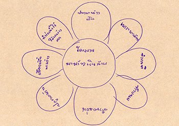 “วิธีแก้ปัญหาจากตนเอง :- ทำการบ้าน แก้คะแนนความประพฤติ / วิธีแก้ปัญหาจากผู้อื่น :- ให้เพื่อนยืมเงินกินข้าว"