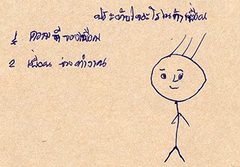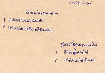 “วิธีแก้ปัญหาจากตนเอง :- เดินหนี / วิธีแก้ปัญหาจากผู้อื่น :- เล่นให้เป็นเวลา ตื่นแต่เช้า"