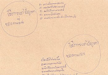 “วิธีแก้ปัญหาจากตนเอง :- ใจเย็นให้มากขึ้น ลดการพูดตรงเกินไป นึกถึงใจคนอื่นมากกว่านี้ ควรเดินออกและไม่พูดอีก ควรรีบเร่งส่งงานและรับผิดชอบมากกว่านี้ / วิธีแก้ปัญหาจากผู้อื่น :- แลกเปลี่ยนความคิดกัน ควรอธิบายให้ชัดเจนกว่านี้ อยากให้มีเวลานานกว่านี้ อยากให้สั่งงานน้อยลง ควรปรับคนละครึ่งเพื่อเข้าใจกันง่ายขึ้น"
