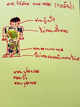 "ชอบ :- ขาเพราะเตะได้, หูเพราะใช้ฟัง / ไม่ชอบเสื้อสวย ไม่ชอบรองเท้าเพราะไม่เท่ / ชอบฟุตบอล ชอบวิ่ง ชอบฟุตซอล"