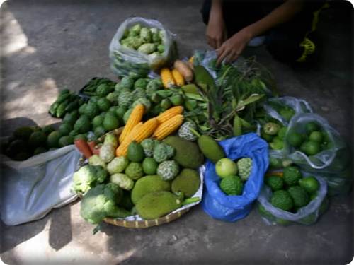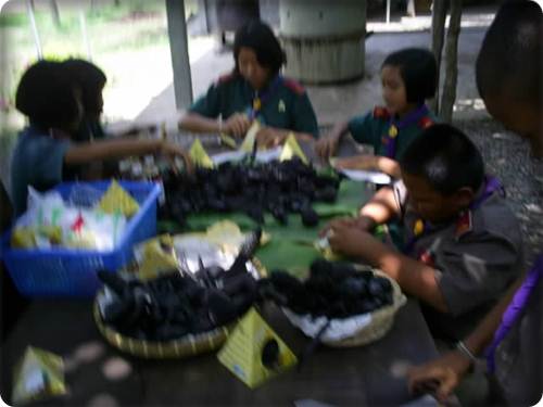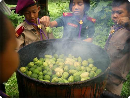 - วางตะแกรงลวดลงบนแท่งเหล็กจัดวางผลไม้ที่ต้องการเผาลงบนตะแกรงเช่น มะกรูด ยอ ฝักบัว ขนุน กล้วย น้อยหน่า และอื่น ๆ ตามฤดูกาล