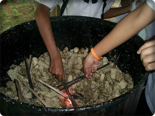- ขณะจุดไฟเมื่อควันลดลงไปถึงช่องใดของเตาให้นำกระป๋องมาอุดที่รูของปล่องไล่ลงไปเรื่อย ๆ จะใช้เวลาในการเผา ประมาณ 8 ชั่วโมง ทิ้งไว้ให้เย็นจึงเก็บถ่านผลไม้ดูดกลิ่นที่ได้