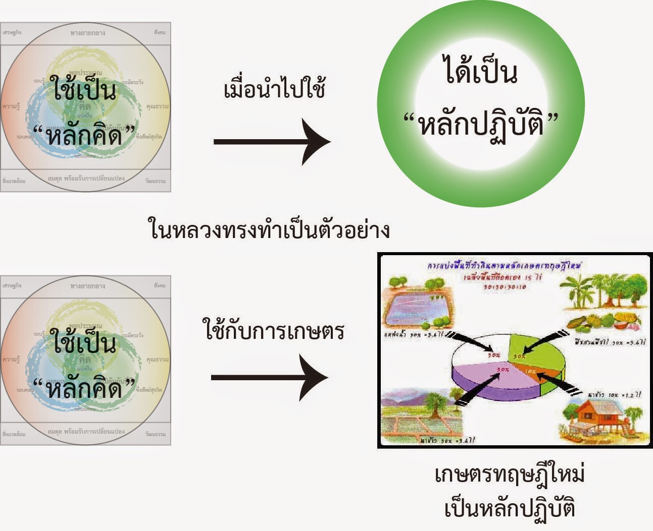 ตัวอย่างที่ชัดเจนที่สุด ในหลวงท่านทรงทดลองใช้ "หลักคิด" กับการเกษตร ผลก็คือ "เกษตรทฤษฎีใหม่" ถือเป็นหลักปฏิบัติที่พระราชทานให้เราชาวเกษตรกร