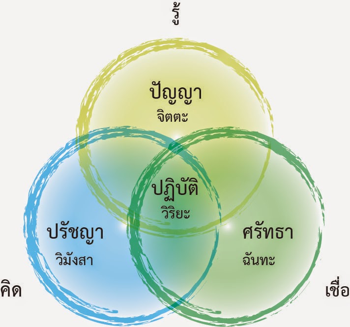 เริ่มที่ทำความเข้าใจความหมายและความแตกต่างระหว่างคำว่า "ศรัทธา" "ปรัชญา" และ "ปัญญา" เชื่อมโยงกับคำง่ายๆ ที่ทุกคนรู้จัก คือ "ศรัทธา=>เชื่อ ปรัชญา=>คิด และ ปัญญา => รู้" ทั้ง ๓ คำคือ "เชื่อ" "คิด" และ "รู้" เป็น "กิริยา" หรือเป็นการกระทำของ "ใจ" ลึกซึ้งกว่าความเข้าใจตามทฤษฎีตะวันตกที่ผูก "คิด" ไว้กับ "สมอง"
