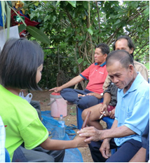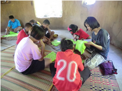 ครั้งแรกจะให้น้องๆช่วยกันอ่านก่อน จากนั้นก็ให้พี่เลี้ยงถามน้องๆทีละบรรทัดว่ามันมีความหมายว่าอย่างไรพร้อมทั้งอธิบายเพิ่มเต็มให้น้องได้เข้าใจถึงความหมาย ทีแรกน้องก็งงไม่ค่อยตอบเพราะไม่เข้าใจความหมาย พี่เลี้ยงส่วนใหญ่เป็นผู้อธิบายให้น้องฟัง เมื่ออธิบายเสร็จก็เป็นการทวน โดยให้น้องๆทวนความเข้าใจของตนเองว่า แต่ละบรรทัดมีความหมายว่าอย่างไร น้องบางคนก็จำได้ บางคนก็จำไม่ได้ คนที่จำไม่ค่อยได้ เห็นเพื่อนตอบ ก็ตอบเสริมช่วยเพื่อนเวลาล่วงมาจวนเที่ยงวันแล้ว กิจกรรมต่อไปก็จะได้พาน้องที่มาเข้าร่วมกิจกรรมไปช่วยงานที่บ้านเจ้าภาพกฐิน แบ่งกลุ่มออกเป็น 3 กลุ่ม กลุ่มที่ 1 เป็นกลุ่มที่ต้องไปทำไอติมหลอดมาเลี้ยงชาวบ้านที่มาร่วมการแห่กองกฐินที่บ้านเจ้าภาพนำทีมโดยโอ๋เล่และมีน้องๆไปช่วยอีกสามคน ส่วนกลุ่มที่ 2 มีสมาชิกเกือบสิบคน กลุ่มนี้ทำหน้าที่บริการน้ำและอาหารเที่ยงให้กับผู้ที่มาร่วมงาน และกลุ่มที่ 3 ทำหน้าที่ ล้างถ้วยจานในงาน เมื่อแบ่งกลุ่มกันเรียบร้อยก็ได้เดินทางไปที่บ้านเจ้าภาพ เมื่อไปถึงบ้านเจ้าภาพก็ได้เจอพระสงฆ์กำลังเทศนาให้โยมฟังอยู่ สายตาของผู้คนที่อยู่บ้านเจ้าภาพ หรือแม้แต่คนที่กำลังฟังเทศน์อยู่ต่างก็หันมาดู ด้วยความโดดเด่นจากการใส่เสื้อบุญกฐินของน้องทุกคน และการเดินไปเป็นขบวนใหญ่ จึงตกเป็นเป้าสายตาได้ง่าย เจ้าภาพก็ตอนรับเป็นอย่างดี ถามว่ากินข้าวกันหรือยัง ถ้ายังไม่กินก็จะหามาให้กิน ทีแรกก็เลยให้น้องๆ เข้าไปนั่งฟังพระท่านเทศนาก่อน จากนั้นผมก็ได้เดินที่ครัวเพื่อที่อยากจะรู้ว่าทางเจ้าภาพกินข้าวกันหรือยัง ปรากฏว่าทางเจ้าภาพได้กินข้าวเที่ยวกันแล้ว กลุ่มที่เตรียมมาว่าจะมาบริการอาหารก็เลยไม่ได้ทำ และกลุ่มที่เตรียมมาล้างถ้วยก็ไม่ได้ทำเพราะทางเจ้าภาพก็ล้างเกือบเสร็จแล้ว ทางเจ้าภาพก็จะหาอาหารมาให้น้องกินผมก็เลยบอกว่าไม่ต้องยกมาให้ เดี๋ยวให้น้องๆไปยกมากันเองดีกว่า เพื่อเป็นตามความประสงค์เท่าที่เราตั้งไว้และพอทำได้