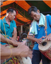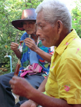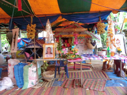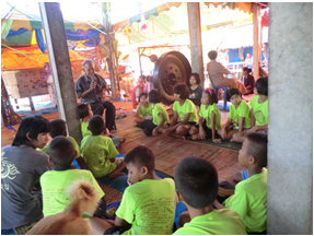 หลังจากพวกเราปูพื้นฐานเกี่ยวกับงานบุญกฐินกับน้องๆ เรียบร้อยแล้ว เราก็ชวนน้องๆ เดินไปบ้านเจ้าภาพที่ตั้งกองกฐิน ซึ่งเจ้าภาพในปีนี้ตั้งใจที่จะทอดกฐินเพื่ออุทิศส่วนบุญส่วนกุศลให้กับแม่ที่ได้ล่วงลับไปแล้ว และเมื่อไปถึงพวกเราก็ได้ขอให้พ่อสวัสดิ์ ซึ่งเป็นมัคทายกวัด และเป็นผู้รู้ในชุมชนได้เป็นคนเล่าเรื่องราวเกี่ยวกับบุญกฐินฉบับชาวบ้าน (บ้านโคกกลาง) ให้พวกเราได้เรียนรู้ พ่อสวัสดิ์เล่าว่า
