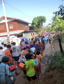 การให้ใช้เวลาไม่นานมาก ขบวนแห่ก็ได้โค้งกลับมาที่บ้านเจ้าภาพเหมือนเดิม สิ่งหนึ่งที่เด็กได้ทำเตรียมไว้ตั้งแต่ตอนบ่าย นั้นคือไอตีมหลอด เมื่อขบวนแห่กลับมาถึง น้องๆเด็กผู้หญิงเป็นคนทำหน้าที่แจกไอตีม เมื่อทุกคนทราบว่ามีไอตีมแจก ต่างก็สนให้ความสนใจ และเมื่อเป็นเช่นนั้นความวุ่นวายก็เกิดขึ้น มือที่ยื่นมาขอไอตีมเรียงรายกันจนน่าตกใจ เสียงที่ส่งออกมาว่า ขอหนึ่งอัน สองอัน เพื่อเอาไปให้คนนั้นคนนี้ดังกล้องไปหมด ทังเด็กทั้งคนแก่ต่างก็มายืนรอกันอย่างแน่ถนัด บ้างคนที่ไม่ทันใจ เขาเลือกยิบหลอดไอตีมไปแคะเอง น้องๆก็ช่วยกันอย่างเต็มที่ ไม่นานไอติมก็หมดถัง แต่ก็ได้เตรียมน้ำหวานไว้เยอะที่จะสามารถทำไอติมได้ 3-4 ครั้ง น้องจึงเริ่มกรอกไอติมใหม่อีกครั้ง 20 นาทีผ่านไปไอติมก็แข็งได้ที่ ครั้งนี้คนเริ่มทยอยหนีหมดแล้ว เหลือแต่ผู้เฒ่าผู้แก่ น้องๆจึงช่วยกันเดินแจกไอตินให้ผู้ใหญ่ทุกคนที่เหลืออยู่ในงาน ดูจากสีหน้าขอน้องๆแล้วคงจะมีความสุขจากการได้ลงมือทำสิ่งดีๆให้กับผู้อื่น