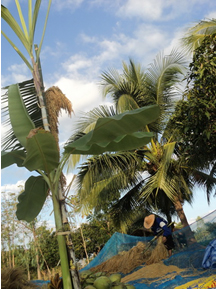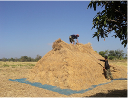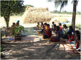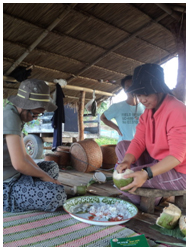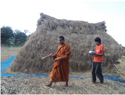 พี่เครือ พี่ปราณีก็มาช่วยกันทำอาหาร พี่เต๊ะช่วยสอยมะพร้าวลงมาให้พวกเราได้ดื่มกินอย่างชื่นใจ แม้วันนี้จะมีลมหนาวพัดเรื่อยๆ แต่แดดก็แรงไม่แพ้กัน พ่อเฉลี่ยกับลูกเขยก็ช่วยกันจัดเรียงกองข้าวให้เป็นลอมสวยงาม แม่สายเจ้าของนาก็ทำหน้าที่ไปบอกกล่าวกับผีตาแฮกว่าวันนี้พวกเรามาทำอะไรกันที่ทุ่งนา ศักดา สร้อย วี โอ๋ พี่สำเนียงก็ช่วยกันจัดแต่งลานข้าว หาข้าวของที่จะประกอบในพิธีกรรม ส่วนผู้เขียนก็เดินพูดคุยตรงนี้บ้าง ตรงโน้นบ้าง หยิบนั่นนิด หยิบนี่หน่อย และคอยตรวจตราว่าข้าวของที่เตรียมมาครบหรือเปล่า สิ่งที่สำคัญที่ต้องมีก็ได้แก่ 1) ใบคูณ ใบยอ อย่างละ 7 ใบ 2) เขาควายหรือเขาวัว (พวกเราหาเขาไม่ได้ ยายต่วนและยายสายสองพี่น้องก็ช่วยกันประยุกต์โดยนำฟางข้าวมามัดให้เป็นเขาควาย) 3) ไข่ 1 ฟอง 4) มัน 1 หัว 5) เผือก 1 หัว 6) ยาสูบ 4 มวน 7) หมาก 4 คำ 8) ข้าวต้ม 1 มัด 9) น้ำ 1 ขัน 10) ขันห้าดอกไม้ธูปเทียน แล้วนำทั้งหมดนี้ใส่ในกล่องข้าว (ยกเว้นน้ำกับเขาควายที่วางไว้ข้างนอก) ทั้งหมดนี้เรียกว่า “ขวัญข้าว” เพื่อเตรียมเชิญแม่ธรณีออกจากลานและบอกกล่าวแม่โพสพก่อนที่จะนวดข้าว นอกจากนี้ก็จะมีอุปกรณ์อื่นๆ ที่นำไปวางไว้ที่หน้าลอม