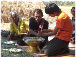 ย แม้แต่พ่อทองเลื่อน คำดอกรัก ผู้รู้ด้านวัฒนธรรมของพวกเราก็แทบจำงานบุญนี้ไม่ได้ แต่ด้วยความไม่รู้และอยากรู้ อีกทั้งอยากทำให้ถูกต้องตามประเพณี เพราะมีความเชื่อว่า หากทำไม่ถูกแล้วก็จะส่งผลเสียมากกว่าผลดี ดังนั้น ต่างคนต่างอาสากันอย่างแข็งขันที่จะไปหาความรู้จากแหล่งต่างๆ เท่าที่พอจะหาได้ เช่น พ่อทองเลื่อนบอกว่าจะอ่านหนังสือพิธีกรรมที่มีบทสวดหรือบทสูตรขวัญข้าว และจะดูว่ามันมีเครื่องอะไรประกอบในพิธีกรรมบ้าง ส่วนพ่อเฉลี่ยก็บอกว่าจะไปถามปู่ที่อยู่อีกหมู่บ้านหนึ่งน่าจะเคยทำ ส่วนผู้เขียนและแกนนำเยาวชนก็ทำตามความถนัดของตนเอง นั่นคือ ค้นจากอินเทอร์เน็ตเจ้าค่ะ!