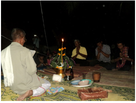 ในช่วงบ่ายพระสงฆ์ที่นิมนต์มาก็ช่วยกันตกแต่งสถานที่ เพื่อทำพิธีกรรมทางสงฆ์ ท่านเจ้าอาวาสก็ได้ไปนำโต๊ะหมู่บูชา พระพุทธรูป อาสนะ ตาละปัด ม้วนด้ายสายสิญจน์ ฯลฯ จากวัดมาเพื่อประกอบพิธีกรรม นี่แสดงถึงความ