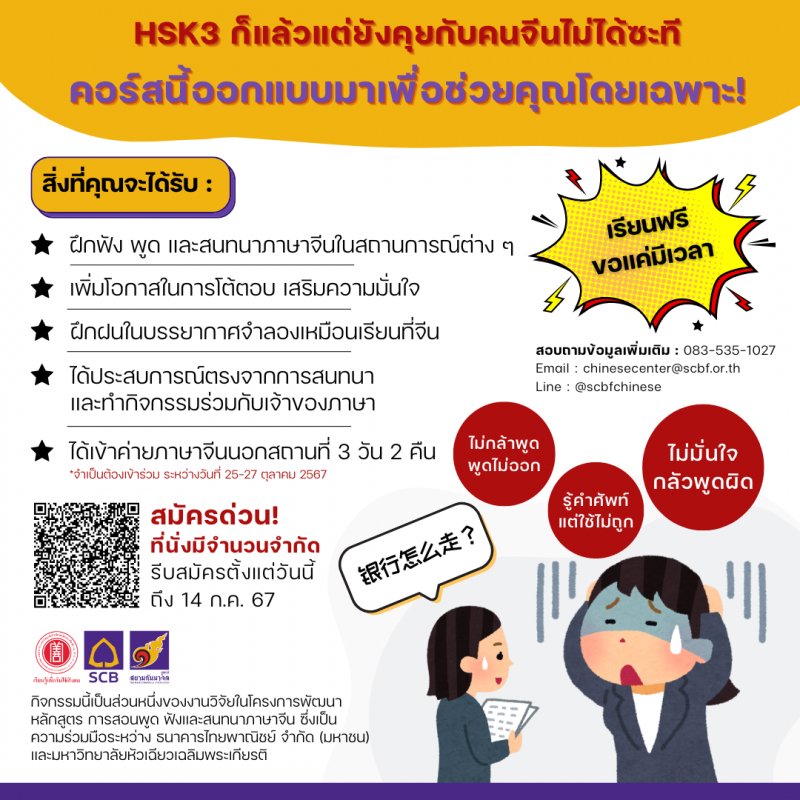 ขณะนี้ โครงการฯ อยู่ระหว่างการเปิดรับผู้เรียนเข้าร่วมเรียนรู้ภาษาจีนผ่านกิจกรรมการพูด ฟัง และสนทนาอย่างเข้มข้น เพื่อพัฒนาผู้เรียนให้มีความมั่นใจ และสามารถสนทนากับคนจีนได้อย่างคล่องแคล่ว ไม่ว่าจะเป็นเรื่องชีวิตประจำวัน การทำงาน และความสนใจของผู้เรียน จึงขอเชิญชวนผู้ที่สนใจสมัครเข้าร่วมโครงการฯ เพื่อพัฒนาทักษะภาษาจีนของตนเอง และเป็นส่วนหนึ่งในการพัฒนานวัตกรรมการเรียนภาษาจีนแนวใหม่ ร่วมกับโครงการฯ โดยไม่เสียค่าใช้จ่ายใด ๆ ทั้งสิ้น
