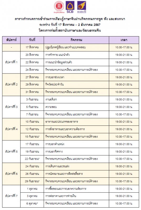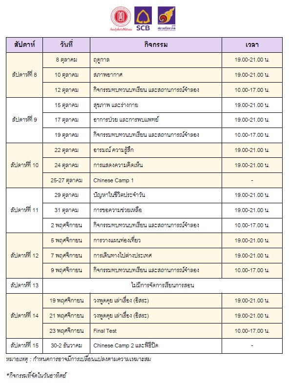 - สามารถเข้าร่วมกิจกรรมค่ายภาษาจีนนอกสถานที่ ระหว่างวันที่ 25-27 ตุลาคม 2567