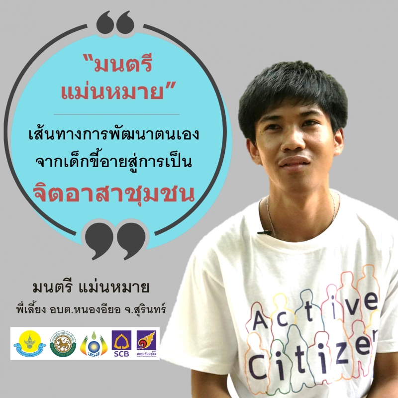 มนตรี แม่นหมาย จากเยาวชนที่พัฒนาตนเอง จากการเข้าร่วมอบรมในค่ายขององค์การบริหารส่วนตำบลหนองอียอ อำเภอสนม จังหวัดสุรินทร์ ตั้งแต่เรียนอยู่ระดับชั้นมัธยมศึกษาที่โรงเรียนหนองอียอวิทยา ปัจจุบันศึกษาอยู่ในระดับชั้นปีที่ 4 ที่มหาวิทยาลัยราชภัฏสุรินทร์ ได้ใช้เวลาว่างในช่วงปิดภาคเรียน มาเป็น “จิตอาสา” ดูแลน้องๆ มาทำหน้าที่ “พี่เลี้ยง”ในค่ายพัฒนาศักยภาพแกนนำเยาวชนสู่การเป็นคนรุ่นใหม่ที่สามารถดึงศักยภาพของตนเองออกมารับใช้ชุมชนสังคมอย่างสร้างสรรค์ ซึ่งจัดขึ้นสองครั้ง(รุ่นที่ 1 วันที่ 19-30 เมษายน 2561รุ่นที่ 2 วันที่ 30 เมษายน-11 พฤษภาคม 2561) วันนี้มาพูดคุยเส้นทางการพัฒนาตนเองสู่การเป็นจิตอาสาชุมชนกัน