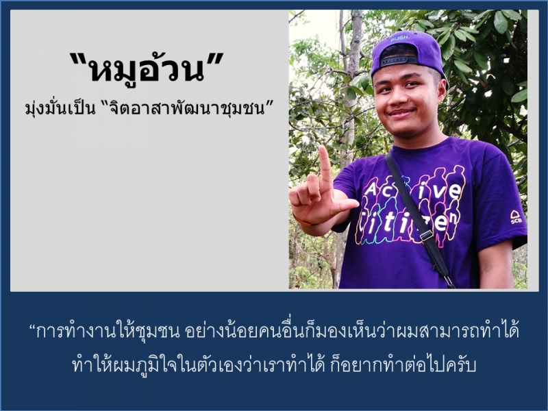 “หมูอ้วน”ได้พัฒนาตนเองอย่างที่ได้พูดเอาไว้ และได้แสดงความสามารถให้คนในชุมชนได้เห็นด้วยการทำประโยชน์ให้กับชุมชน เช่น งานวันเด็กที่ผ่านมา กลุ่มเยาวชนฯ ได้ร่วมกันจัดงานกันเอง ทั้งกิจกรรมและเป็นวิทยากรเอง ทำให้ได้รับเสียงชื่นชมจากผู้ใหญ่ในชุมชน ทำให้เจ้าตัวเกิดความรู้สึกภาคภูมิใจและความสุข “การทำงานให้ชุมชนอย่างน้อยคนอื่นก็มองเห็นว่าผมสามารถทำได้ ทำให้ผมภูมิใจในตัวเอง หลังเสร็จงานวันเด็กผมไปกินก๋วยเตี๋ยวในหมู่บ้าน มีป้าคนหนึ่งบอกว่าเด็กคนนี้พูดเก่งๆ ผมก็รู้สึกภูมิใจตัวเองว่าเราทำได้ ก็อยากทำต่อไปครับ”