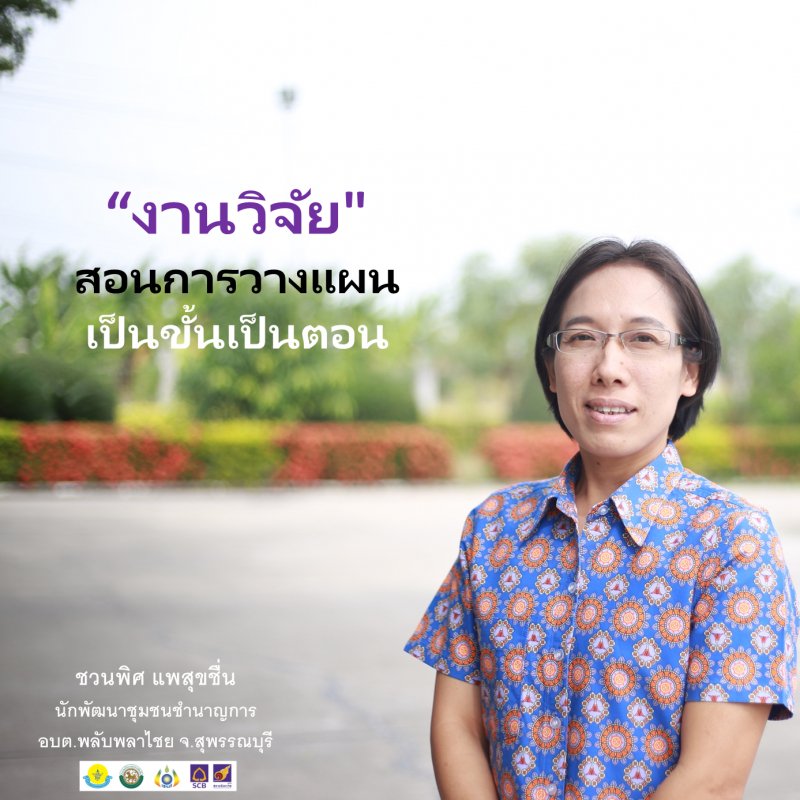อบต.พลับพลาไชย อำเภออู่ทอง จังหวัดสุพรรณ ได้ดำเนินการทำโครงการศึกษากระบวนการมีส่วนร่วมของชุมชนตำบลพลับพลาไชยในการพัฒนาศักยภาพของเด็กและเยาวชนให้อยู่ในสังคมอย่างมีความสุข ภายใต้โครงการพัฒนาเยาวชนในชุมชนท้องถิ่น 4 ภาค ระยะที่ 3 : ขับเคลื่อนกลไกเพื่อพัฒนาเด็กและเยาวชนด้วยหลักการจัดการความรู้และกระบวนการวิจัย โดยส่งเจ้าหน้าที่มาร่วมพัฒนางานด้านเด็กและเยาวชน โดยหนึ่งในนั้นคือ "น้อง-ชวนพิศ แพสุขชื่น" นักพัฒนาชุมชนชำนาญการ ซึ่งดูแลโครงการร่วมกับหล้าที่หมู่ 7 สรุปบทเรียนของตัวเองว่า "กระบวนการวิจัยสอนให้เธอวางแผนเป็นขั้นเป็นตอน และเมื่อลงมือปฏิบัติเสร็จแล้วต้องสรุปว่าทำไปแล้วเกิดประโยชน์อย่างไร ใครได้รับประโยชน์นี้บ้าง ทำให้รู้จักประเมินผลลัพธ์ เห็นจุดผิดพลาดที่จะพัฒนาต่อ และมองหาภาคี เพื่อร่วมงาน หรือที่ปรึกษามาช่วยเติมเต็มการทำงาน เพราะปัญหาหลายอย่างก็ไม่สามารถแก้ไขได้เพียงลำพัง"