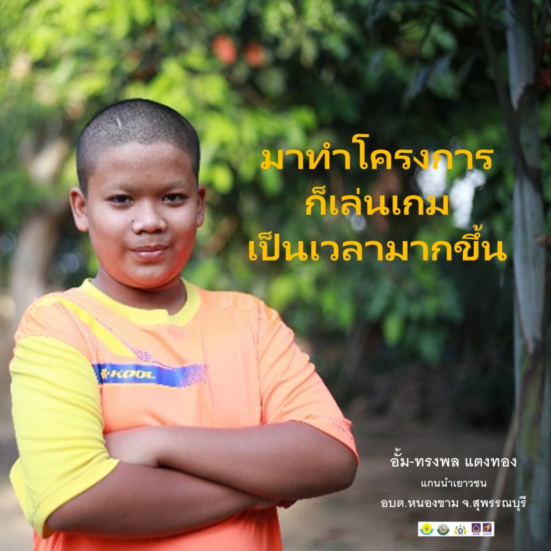 น้องอั้ม-เด็กชายทรงพล แตงทอง ตัวแทนเยาวชนจากหมู่ 1 โครงการมาลัยร้อยรัก มีพี่ผา-ธัญญาภรณ์ แตงทอง ผู้ดูแลเด็ก เป็นผู้รับผิดชอบ น้องอั้มบอกว่า โครงการนี้สามารถต่อยอดเป็นอาชีพหลักหรืออาชีพเสริมได้