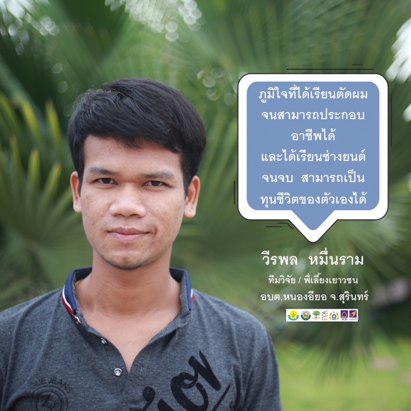 | ทำงานกับเยาวชนมาตั้งแต่อายุ 13 ปี จนถึงปัจจุบัน | ภูมิใจที่ได้เรียนการตัดผมจนสามารถประกอบอาชีพได้ และได้เรียนช่างยนต์จนจบ สามารถเป็นทุนชีวิตของตัวเองได้ และสามารถเป็นทางเลือกในการใช้ชีวิต |
