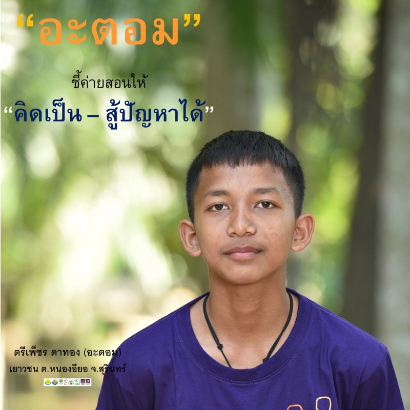 "อะตอม – ตรีเพ็ชร ดาทอง" อายุ 15 ปี เรียนอยู่มัธยมศึกษาปีที่ 3 โรงเรียนหนองอียอวิทยา หนึ่งในเยาวชนในระบบจากตำบลหนองอียอ ที่มาร่วมเรียนรู้ในค่ายพัฒนาศักยภาพและสร้างเครือข่ายเยาวชนทั้งในและนอกระบบการศึกษา 25 อปท. จังหวัดสุรินทร์ (ภายใต้การดำเนินโครงการพัฒนาเยาวชนในชุมชนท้องถิ่น 4 ภาค) สนับสนุนโดยกรมส่งเสริมการปกครองท้องถิ่น , กสศ. , สถาบันยุวโพธิชน , สกสว. , ธนาคารไทยพาณิชย์ จำกัด(มหาชน) และมูลนิธิสยามกัมมาจล เมื่อวันที่ 1- 21 ตุลาคม 2562 ณ หน่วยอนุรักษ์และจัดการต้นน้ำห้วยสามสบ ต.ศรีสะเกษ อ.นาน้อย จ.น่าน ซึ่งเสร็จสิ้นไปเรียบร้อยแล้ว “อะตอม” ได้ร่วมสะท้อนการเรียนรู้ได้อย่างน่าสนใจว่า..
