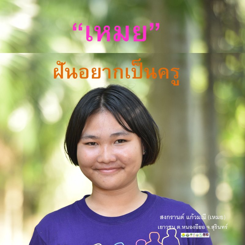 "เหมย - สงกรานต์ แก้วมณี"อายุ 17 ปี เรียนอยู่มัธยมศึกษาปีที่ 5 โรงเรียนหนองอียอวิทยา หนึ่งในเยาวชนในระบบจากตำบลหนองอียอ ที่มาเข้าร่วมเรียนรู้ใน ค่ายพัฒนาศักยภาพและสร้างเครือข่ายเยาวชนทั้งในและนอกระบบการศึกษา 25 อปท. จังหวัดสุรินทร์ (ภายใต้การดำเนินโครงการพัฒนาเยาวชนในชุมชนท้องถิ่น 4 ภาค) สนับสนุนโดยกรมส่งเสริมการปกครองท้องถิ่น , กสศ. , สถาบันยุวโพธิชน , สกสว. , ธนาคารไทยพาณิชย์ จำกัด(มหาชน) และมูลนิธิสยามกัมมาจล เมื่อวันที่ 1- 21 ตุลาคม 2562 ณ หน่วยอนุรักษ์และจัดการต้นน้ำห้วยสามสบ ต.ศรีสะเกษ อ.นาน้อย จ.น่าน ซึ่งเสร็จสิ้นไปเรียบร้อยแล้ว “เหมย ” เผยว่าเป้าหมายในชีวิต คือ เป็นครู ซึ่งเธอจะตั้งใจเรียนเพื่อให้ได้ทำงานในอาชีพที่เธอฝันให้ได้ และได้สัญญากับตนเองว่าจะต้องทำ 10 อย่างนี้ให้ได้ภายใน 3 เดือน