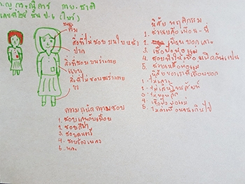 "สำรวจรูปร่าง-หน้าตา :- ชอบคิ้วและแขน, ไม่ชอบปากและขา / นิสัยด้านบวก :- ช่วยเหลือเพื่อน-พี่ เชื่อฟังพ่อ-แม่ ช่วยเหลือพ่อ-แม่ ไม่เที่ยว ไม่เล่นโทรศัพท์ ไม่นอนดึก ไม่ด่าเพื่อน / ความถนัด-ความชอบ :- ชอบเล่นกีฬา ดนตรี ร้องเพลง วิชาพละ ชอบเล่นกับเพื่อน"