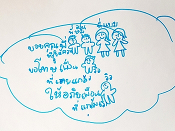 "ขอบคุณ :- พี่หมูอ้วน, พี่แบม และพี่ทำให้ควาามรู้ / ขอโทษ :- เพื่อน ที่เราแกล้ง / ให้อภัย :- เพื่อน ที่แกล้งเรา่"