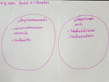 "วิธีแก้ปัญหาจากตัวเรา :- อย่าเอาความคิดของตนเองมากกว่าคนอื่น ไม่เห็นแก่ตัว / วิธีแก้ปัญหาจากผู้อื่น :- ให้เพื่อนนั่งนิ่งๆ ไม่แหย่ ให้เพื่อนช่วยคิดงานบ้าง"