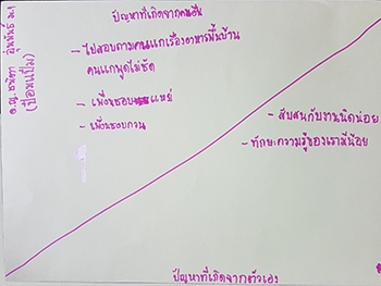 "ปัญหาจากตัวเรา :- สับสนกับงานนิดหน่อย ทักษะความรู้มีน้อย / ปัญหาจากผู้อื่น :- สอบถามคนแก่ผู้รู้แต่คนแก่พูดไม่ชัด เพื่อนชอบแหย่ชอบกวน"