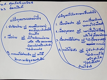 "วิธีแก้ปัญหาจากตัวเรา :- หัวร้อน-สงบสติอารมณ์อยู่คนเดียวแล้วค่อยไปทำงานต่อ เบื่อ-ตั้งใจทำงานต่อจนเสร็จหรือออกมากจากห้องแป๊บหนึ่งแล้วเข้าไปทำงานต่อ วางแผนไม่เป็น-หาวิธีศึกษาหาข้อมูลจนทำเป็น / วิธีแก้ปัญหาจากผู้อื่น :- เพื่อนติดเล่น-ชวนเพื่อนทำงานหางานให้เพื่อนทำ เพื่อนพูดมาก-บอกเพื่อนให้เงียบๆแล้วให้เพื่อนทำงาน เพื่อนลายมือไม่สวย-ให้เพื่อนวาดรูปและตกแต่ง บอกอะไรไม่ฟัง-ขู่ว่าถ้าไม่ทำงานก็ไม่เสร็จแลเราก็จะไม่ทำเหมือนกัน"