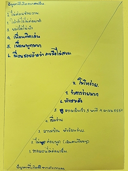 "ปัญหาจากตัวเรา :- วางแผนไม่ค่อยเป็น ไม่ค่อยพูด อารมณ์ร้อน หัวร้อนง่าย เบื่อง่าย อารมณ์เปลี่ยนเร็ว หัวเราะดัง ขี้รำคาญ ขี้โมโห / ปัญหาจากผู้อื่น :- เพื่อนไม่ค่อยช่วยงาน ให้ทำอะไรก็ไม่ค่อยทำ บอกอะไรไม่ฟัง เพื่อนติดเล่น เพื่อนพูดมาก เพื่อนชอบอ้างว่าลายมือไม่สวย"