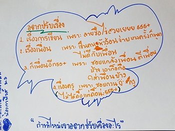 "เรื่องการเขียนเพราะลายมือไม่สวยเลย เรื่องเพื่อนเพราะเป็นคนหัวร้อนง่าย บางครั้งก็พูดไม่ดีกับเพื่อน และชอบแกล้งเพื่อน เรื่องครูเพราะชอบกวนและดื้อกับครู"