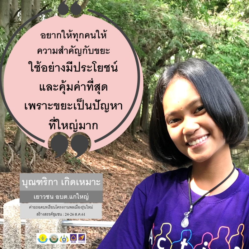 อยากให้ทุกคนให้ความสำคัญกับขยะ ใช้อย่างมีประโยชน์และคุ้มค่าที่สุด เพราะขยะเป็นปัญหาที่ใหญ่มาก อยากให้ช่วยกันคนละไม้คนละมือจะได้ไม่เหนื่อยมาก ทำโครงงานคือโครงงานชื่อว่าบ้านจัดสรรขยะ มีการแบ่งหน้าที่อย่างชัดเจน ข้าวเป็นคนสำรวจพื้นที่ผิด เอกสาร เจมส์ ดูแลการอบรม เป็นคนจัดอบรมพูด ให้ความรู้ แบ่งปันประสบการณ์ ลงพื้นที่เก็บขยะ และมีการถอดบทเรียนหลังการทำกิจกรรม แพรทำหน้าที่ดีมาก มีการจัดบอร์ดเข้าร่วมอบรม ชวนทุกคนเล่นเกมและเก็บขยะ และมาถอดบทเรียนกับข้าว แนทช่วยแพรจัดบอร์ด หน้าที่ที่เหลือก็เหมือนทุกๆ คน