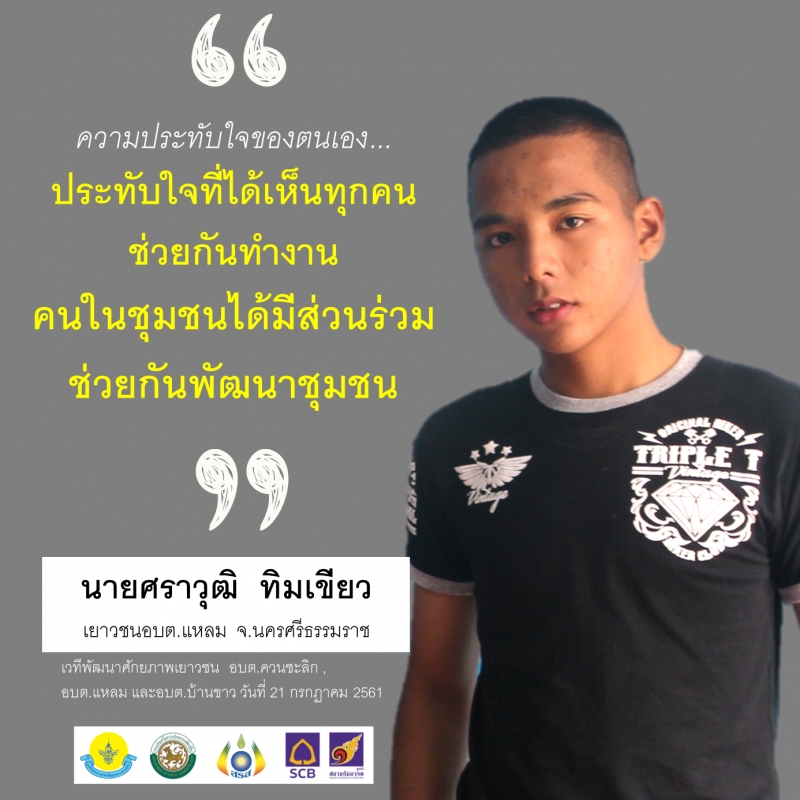 "ประทับใจที่ได้เห็นทุกคนช่วยกันทำงาน และคนในชุมชนได้มีส่วนร่วมช่วยกันพัฒนาชุมชน และทำให้วัยรุ่นในชุมชนมีความสนิทกันมากขึ้น"