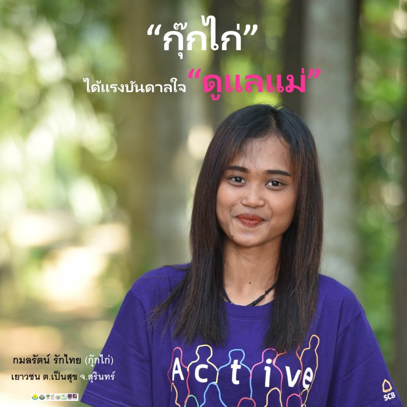 "กุ๊กไก่ - กมลรัตน์ รักไทย"อายุ 17 ปี ปัจจุบันเรียนอยู่ชั้นมัธยมศึกษาปีที่ 5 กศน.จอมพระ เป็นตัวแทนเยาวชนจากตำบลเป็นสุข มาร่วมเรียนรู้ในค่ายพัฒนาศักยภาพและสร้างเครือข่ายเยาวชนทั้งในและนอกระบบการศึกษา 25 อปท. จังหวัดสุรินทร์ (ภายใต้การดำเนินโครงการพัฒนาเยาวชนในชุมชนท้องถิ่น 4 ภาค) สนับสนุนโดยกรมส่งเสริมการปกครองท้องถิ่น , กสศ. , สถาบันยุวโพธิชน , สกสว. , ธนาคารไทยพาณิชย์ จำกัด(มหาชน) และมูลนิธิสยามกัมมาจล เมื่อวันที่ 1- 21 ตุลาคม 2562 ณ หน่วยอนุรักษ์และจัดการต้นน้ำห้วยสามสบ ต.ศรีสะเกษ อ.นาน้อย จ.น่าน หลังจากเสร็จสิ้นการอบรมในค่าย 21 วัน เรียบร้อยแล้ว “กุ๊กไก่"ได้มาแชร์ประสบการณ์การเรียนรู้ในค่ายนี้ให้เพื่อน ๆ ได้ฟังกัน