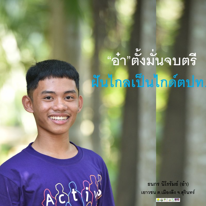 นายธนกร นิโรรัมย์ (อ๋า) อายุ 15 ปี เยาวชนจากตำบลเมืองลีง หลังจากเรียนรู้จากค่ายพัฒนาศักยภาพและสร้างเครือข่ายเยาวชนทั้งในและนอกระบบการศึกษา 25 อปท. จังหวัดสุรินทร์ (ภายใต้การดำเนินโครงการพัฒนาเยาวชนในชุมชนท้องถิ่น 4 ภาค) สนับสนุนโดยกรมส่งเสริมการปกครองท้องถิ่น , กสศ. , สถาบันยุวโพธิชน , สกสว. , ธนาคารไทยพาณิชย์ จำกัด(มหาชน) และมูลนิธิสยามกัมมาจล เมื่อวันที่ 1- 21 ตุลาคม 2562 ณ หน่วยอนุรักษ์และจัดการต้นน้ำห้วยสามสบ ต.ศรีสะเกษ อ.นาน้อย จ.น่าน ซึ่งเสร็จสิ้นไปเรียบร้อยแล้ว และ “อ๋า” ได้ตั้งเป้าหมายในอนาคตอยากเรียนให้จบปริญญาตรี และฝันไกลเป็นไกด์ต่างประเทศให้ได้ “อ๋า” ได้มาพูดคุยเรื่องราวของตนเองและการเปลี่ยนแปลงตนเองภายหลังค่ายให้ฟัง..