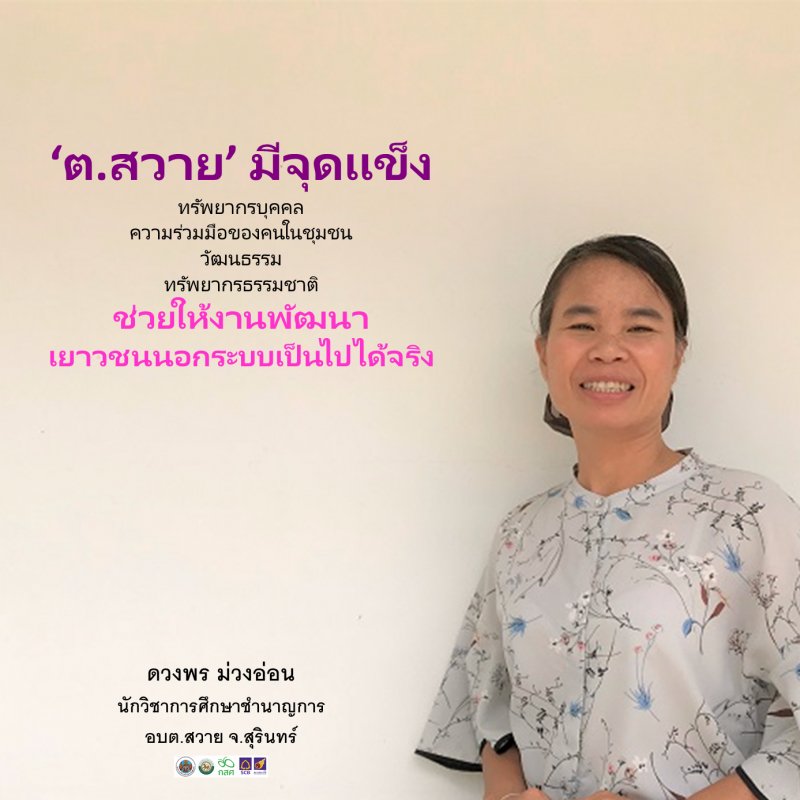 โครงการจัดการศึกษาเชิงพื้นที่เพื่อความเสมอภาคทางการศึกษา จังหวัดสุรินทร์เป็นโครงการความร่วมมือระหว่างสำนักงานกองทุนเพื่อความเสมอภาคทางการศึกษา (กสศ.) สมัชชาการศึกษาจังหวัดสุรินทร์ คณะกรรมการการจัดการศึกษาเชิงพื้นที่จังหวัดสุรินทร์ องค์การบริหารส่วนจังหวัดสุรินทร์ 25 อปท.จังหวัดสุรินทร์ และมูลนิธิสยามกัมมาจล ธนาคารไทยพาณิชย์ จำกัด (มหาชน) เพื่อการพัฒนาเยาวชนนอกระบบการศึกษาในพื้นที่ขยายผล 25 อปท.จังหวัด มีเป้าหมายเพื่อเพิ่มสมรรถนะศักยภาพของผู้บริหารและเจ้าหน้าที่องค์กรปกครองส่วนท้องถิ่น (อปท.) ให้มีบทบาทเป็น "พี่เลี้ยง" ทำหน้าที่โคช สนับสนุนและส่งเสริมการเรียนรู้ของเยาวชนด้วยการทำโครงงานพร้อมกระบวนการวิจัยเพื่อท้องถิ่น และเป็นเจ้าภาพหลักขับเคลื่อนกลไกเพื่อการพัฒนาเยาวชนนอกระบบการศึกษาระดับตำบล อำเภอและจังหวัด ซึ่งอบต.สวาย อ.เมือง จ.สุรินทร์เป็นหนึ่งในพื้นที่ขยายผล เรามาทำความรู้จักการทำงานด้านเด็กและเยาวชน ของอบต.สวาย ผ่าน "ดวงพร ม่วงอ่อน"นักวิชาการศึกษาชำนาญการ