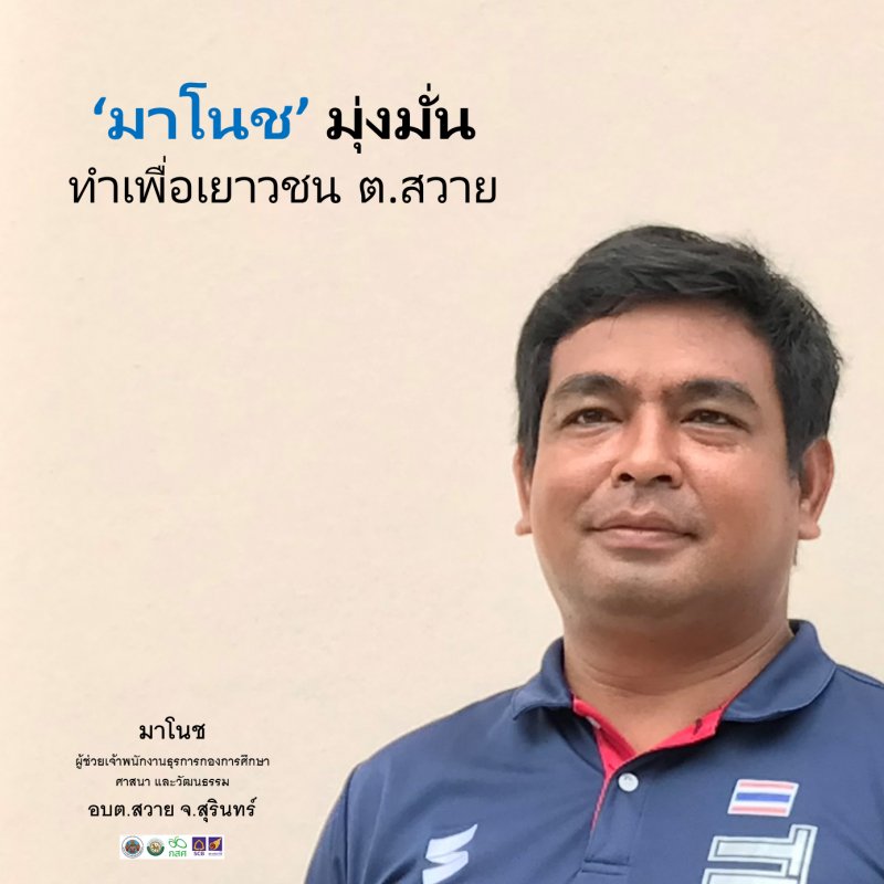 โครงการจัดการศึกษาเชิงพื้นที่เพื่อความเสมอภาคทางการศึกษา จังหวัดสุรินทร์ เป็นโครงการความร่วมมือระหว่างสำนักงานกองทุนเพื่อความเสมอภาคทางการศึกษา (กสศ.) สมัชชาการศึกษาจังหวัดสุรินทร์ คณะกรรมการการจัดการศึกษาเชิงพื้นที่จังหวัดสุรินทร์ องค์การบริหารส่วนจังหวัดสุรินทร์ 25 อปท.จังหวัดสุรินทร์ และมูลนิธิสยามกัมมาจล ธนาคารไทยพาณิชย์ จำกัด (มหาชน) เพื่อการพัฒนาเยาวชนนอกระบบการศึกษาในพื้นที่ขยายผล 25 อปท.จังหวัด มีเป้าหมายเพื่อเพิ่มสมรรถนะศักยภาพของผู้บริหารและเจ้าหน้าที่องค์กรปกครองส่วนท้องถิ่น (อปท.) ให้มีบทบาทเป็น "พี่เลี้ยง" ทำหน้าที่โคช สนับสนุนและส่งเสริมการเรียนรู้ของเยาวชนด้วยการทำโครงงานพร้อมกระบวนการวิจัยเพื่อท้องถิ่น และเป็นเจ้าภาพหลักขับเคลื่อนกลไกเพื่อการพัฒนาเยาวชนนอกระบบการศึกษาระดับตำบล อำเภอและจังหวัด ซึ่งอบต.สวาย อ.เมือง จ.สุรินทร์ เป็นหนึ่งในพื้นที่ขยายผล เรามาทำความรู้จักการทำงานด้านเด็กและเยาวชน ของอบต.สวาย ผ่าน "มาโนช พิมพ์สัน" ผู้ช่วยเจ้าพนักงานธุรการกองการศึกษา ศาสนา และวัฒนธรรม ที่มาเข้าร่วมโครงการและมีบทบาทสำคัญในการทำงานด้านเด็กและเยาวชนเช่นเดียวกัน