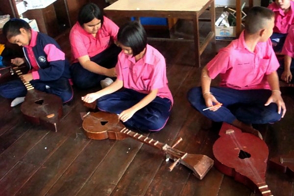 ใครจะรู้ว่าซะล้อ ส่วนไหนเป็นหย่อง ส่วนไหนเป็นนม ปาก รัดอก คันชัก อยู่ไหน คืออะไร ถ้าเด็กไม่เรียนก็จะไม่รู้เลย ซึ่งเหล่านี้คือภูมิปัญญาที่สั่งสมสืบทอดมาของท้องถิ่นที่เราสอดแทรกเข้าไปในตัวเด็กผ่านกระบวนการสอนของครู จากนั้นผมจึงให้ใบงานเด็กไปสืบค้นว่าสิ่งที่ชำรุดคืออะไรบ้างและโยนคำถามกับเขาว่าวัสดุอุปกรณ์ที่เขาใช้ทำเครื่องดนตรีคืออะไรบ้าง เป็นกุศโลบายให้เขาค้นพบและได้ทำโครงงานไปในเวลาเดียวกัน แต่เรายังไม่บอกเขาว่าเป็นโครงงาน คราวนี้เขาก็มาบอกว่าอุปกรณ์ไม้เขาชำรุด เขาจะเอาอะไรมาซ่อมดี เราก็ถามเขาว่าที่บ้านลูกมีไม้อะไรน่าจะใช้แทนได้บ้าง วันรุ่งขึ้นเขาก็เอาไม้ไผ่จากที่บ้านมาหั่น มาผ่า มาวัดกันเอง เช่นกันกับซะล้อที่ไม่มีสาย ซึ่งปกติเราจะใช้สายกีตาร์เพราะจะมีเสียงกังวานขึ้น แต่เราก็ให้เด็กเขาคิด เขาเสนอให้นำสายเบรครถจักรยานและสายลวดมาทดแทนไม่ต้องซื้อ จุดนี้ผมต้องการจะบอกเขาว่า การใช้สิ่งของที่พอเหมาะพอดีกับตัวเองทำอย่างไร เป็นการฝึกให้เขา มีเหตุผล ผมไม่ได้ใส่ใจว่าเด็กจะต้องเล่นได้หรือใช้ได้ดี แต่สนใจที่ว่าพอใช้ได้ และใช้อย่างคุ้มค่า อันนี้เป็นเรื่องของ ความพอประมาณ ที่เราสอดแทรกให้เขาได้รู้จัก และเวลาที่เขาไปเล่นที่งานไหนแล้วของชำรุด เขาจะเกิดกระบวนการแก้ไขปัญหา เป็น การมีภูมิคุ้มกัน ในการคิดและการทำงาน ดนตรีแห่งความพอเพียงของเราจึงเกิดเป็นเพลงขึ้นมา
