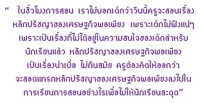 “ในชั่วโมงการสอนเราไม่บอกเด็กว่าวันนี้ครูจะสอนเรื่องหลักปรัชญาของเศรษฐกิจพอเพียง เพราะเด็กไม่ฟังแน่ๆ เพราะเป็นเรื่องที่ไม่ได้อยู่ในความสนใจของเด็ก สำหรับนักเรียนแล้วหลักปรัชญาของเศรษฐกิจพอเพียงเป็นเรื่องน่าเบื่อไม่ทันสมัย ครูต้องคิดให้ออกว่า จะสอดแทรกหลักปรัชญาฯ ลงไปในการเรียนการสอนอย่างไรเพื่อไม่ให้นักเรียนสะดุด”