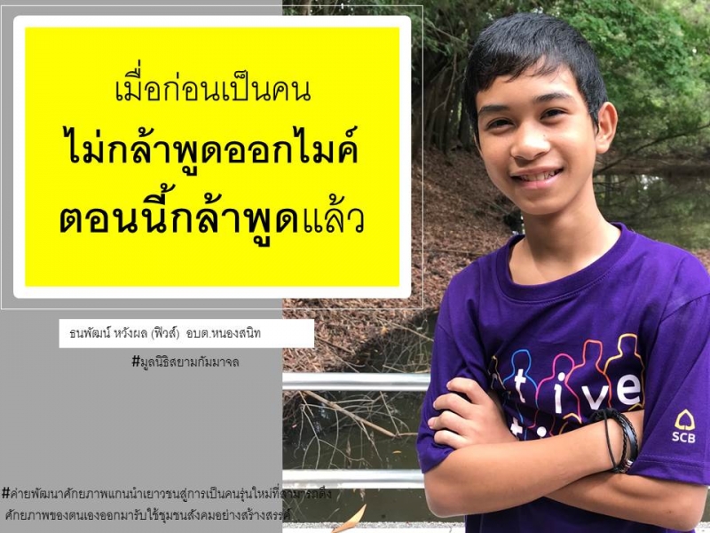 มีความกล้าที่จะพูดมากขึ้นเพราะว่ามีเพื่อน ๆพี่ ๆที่คอยให้กำลังใจอยู่จึงทำให้ผมไม่กลัวที่จะแสดงออก อยากกลับไปพัฒนาตัวเอง มีความกลับที่จะปรับตัวเข้าหาสังคมมากขึ้น