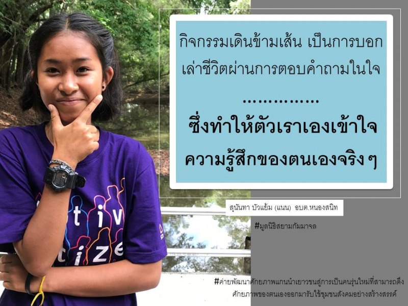 กิจกรรมสวดมนต์ นั่งสมาธิ เดินข้ามเส้น เป็นการรู้จักตนเองและเข้าใจตนเอง โดยสวดมนต์ก็เป็นการฝึกการอ่านภาษาบาลี การนั่งสมาชิกคือการทำจิตใจให้สงบ เดินข้ามเส้นเป็นการบอกเล่าชีวิตผ่านการตอบคำถามในใจซึ่งทำให้ตัวเราเองเข้าใจความรู้สึกของตนเองจริง