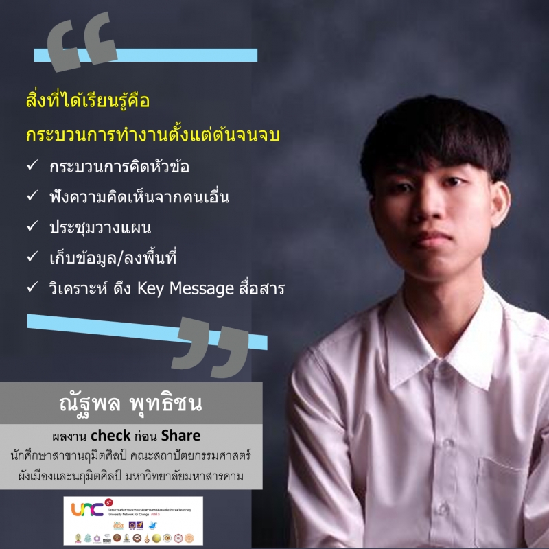 กระบวนการที่เราได้จากโครงการ UNC ตั้งแต่แรกจนจบงาน ตั้งแต่แรกเราก็เริ่มมาคิดหัวข้อกันก่อน ซึ่งเป็นจุดสำคัญ ถ้าเราขาดตรงนี้ไปก็คงไม่ได้ เป็นจุดที่ต้องฟังความเห็นจากคนอื่นและมาช่วยกันคิดว่าหัวข้อว่าแต่ละอย่างจะดีหรือเปล่า แล้วพอได้หัวข้อมาแล้ว ก็เริ่มมาประชุมกัน วางแผนว่าจะไปเก็บข้อมูลกันอย่างไรจากการลงพื้นที่ พอได้ข้อมูลมาแล้วก็เอาข้อมูลทั้งหมดมารวมกัน จากแต่ละคน และเอามาวิเคราะห์ขัดเกลาและดึง Key message ออกมาว่าต้องการจะสื่ออะไรและดึงปัญหาที่เราได้มาเอามาเจาะให้ลึกลงไป จากการทำงานในที่นี้เราไม่ได้ทำงานแบบแค่ให้เสร็จ แต่จะทำอะไรต้องมีแผนก่อนและสามารถนำไปใช้ได้กับทุกอย่าง ทางการเรียนถ้าการเรียนเราไม่มีแผนอาจจะทำออกมาไม่ดี