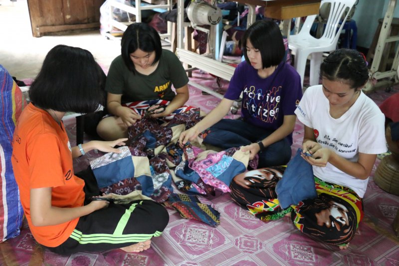 แต่การฝึกฝนไม่ได้จบลงแค่นั้น ทีมงานนัดรวมกลุ่มกันเข้าไปขอความรู้และฝึกฝนการเย็บกับแม่บ้านวิสาหกิจชุมชนอีกถึง 3 ครั้ง เพื่อพัฒนาฝีมือตัวเองให้สามารถถ่ายทอดความรู้แก่รุ่นน้องได้อย่างไม่เคอะเขิน